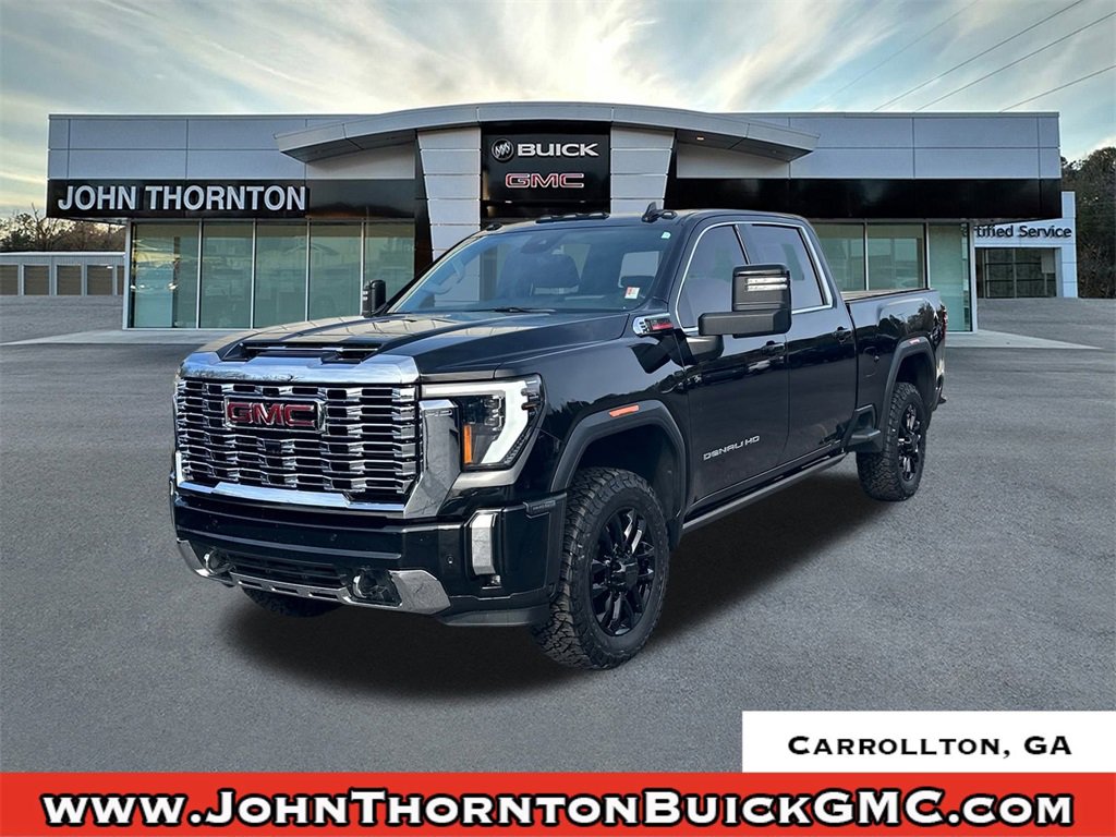 We are your premier Carrollton, GA Cadillac dealership. John Thornton Cadillac Inc. Is family owned, and it is our goal to provide you with an excellent purchase and ownership experience. We also proudly serve Douglasville Cadillac customers. Whether you're searching for a new or used car near Douglasville or Bremen, researching financing options, or looking for a quick quote on a car, truck, or SUV, the friendly, yet professional staff at our Carrollton Cadillac dealership is ready to provide you with all the help you need. We are proud to serve Bremen Cadillac customers. We have served as your premier Cadillac dealer for the entire West Georgia area for over 45 years. Denali Reserve Package (Power Sunroof), Gooseneck/5th Wheel Prep Package, Preferred Equipment Group 5SA (120-Volt Bed Mounted Power Outlet, 120-Volt Instrument Panel Power Outlet, 2 Charge-Only Rear USB Ports, 2 Charge/Data USB Ports Inside Center Console, 2 USB Ports, 2-Speed Active Transfer Case, Bed View Camera w/2 Trailer Camera Provisions, Bose Premium 7-Speaker Sound System, Deep-Tinted Glass, Electric Rear-Window Defogger, Floor-Mounted Center Console, Front Rain-Sensing Wipers, GMC Connected Access Capable, HD Surround Vision, Heated 2nd Row Outboard Seats, Heated Driver & Front Outboard Passenger Seats, Integrated Trailer Brake Controller, Keyless Open & Start, LED Cargo Area Lighting, LED Smoked Amber Roof Marker Lamps, Manual Tilt-Wheel/Telescoping Steering Column, OnStar & GMC Connected Services Capable, Polished Exhaust Tip, Power Front Passenger Windows w/Express Up/Down, Power Sliding Rear Window w/Defogger, Push Button Start, Rear Cross Traffic Alert, Rear Wheelhouse Liners, Remote Vehicle Starter System, Safety Alert Seat, Signature Chrome Denali Grille, SiriusXM w/360L, Spray-On Bedliner w/Denali Logo, Steering Wheel Audio Controls, Trailer Cam Provisions & Trailer Viewing Software, Trailer Side Blind Zone Alert, Ultrasonic Front & Rear Park Assist, Unauthorized Entry Theft-Deterrent System, Universal Home Remote, Ventilated Driver & Front Passenger Seats, Wireless Charging, and Wireless Phone Projection), Technology Package (Adaptive Cruise Control, Inside Rearview Auto-Dimming Rear Camera Mirror, and Multicolor 15 Diagonal Head-Up Display), X31 Off-Road Package (Hill Descent Control), 10-Speed Automatic, 4WD, Jet Black Leather, 12-Way Power Driver Seat Adjuster w/Lumbar, 12-Way Power Passenger Seat Adjuster w/Lumbar, 220-Amp Alternator, 3.42 Axle Ratio, 4-Wheel Disc Brakes, 7 Speakers, ABS brakes, Air Conditioning, Alloy wheels, AM/FM radio: SiriusXM with 360L, Apple CarPlay/Android Auto, Auto High-beam Headlights, Auto-dimming door mirrors, Auto-dimming Rear-View mirror, Automatic Emergency Braking, Automatic temperature control, Brake assist, Buckle to Drive, Bumpers: body-color, Compass, Delay-off headlights, Driver door bin, Driver Memory, Driver vanity mirror, Dual front impact airbags, Dual front side impact airbags, Electronic Stability Control, Emergency communication system: OnStar and GMC connected services capable, Engine Block Heater, Exhaust Brake, Following Distance Indicator, Forge Perforated Leather-Appointed Front Seat Trim, Forward Collision Alert, Front anti-roll bar, Front Bucket Seats, Front Center Armrest, Front dual zone A/C, Front fog lights, Front Pedestrian Braking, Front reading lights, Front wheel independent suspension, Fully automatic headlights, Garage door transmitter, Genuine wood dashboard insert, Genuine wood door panel insert, GMC MultiPro Tailgate Step Lights (LPO), Heated door mirrors, Heated front seats, Heated rear seats, Heated steering wheel, Heavy-Duty 80 Amp Battery, Hitch Guidance w/Hitch View, Illuminated entry, In-Vehicle Trailering System App, IntelliBeam Automa